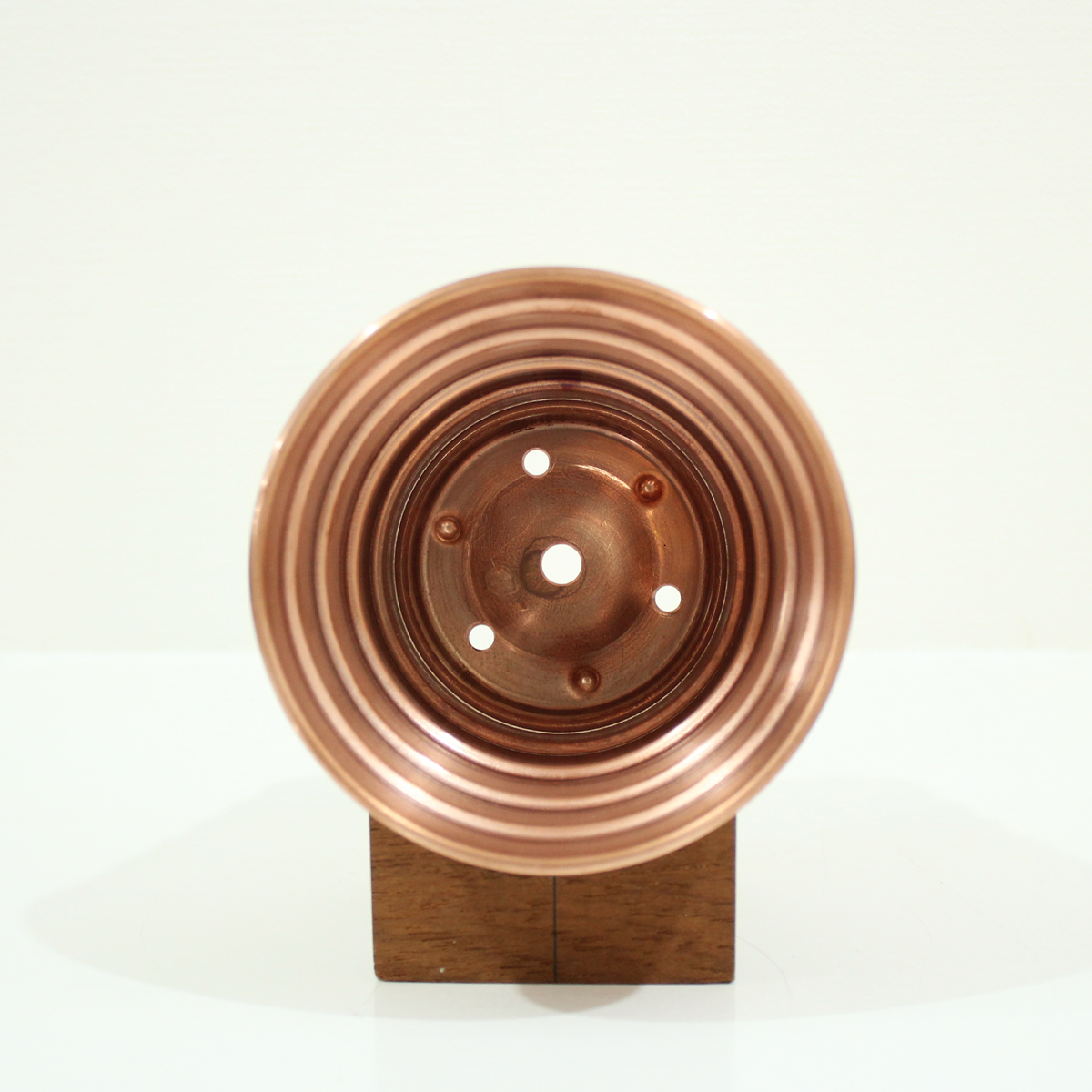 熟練工の職人による伝統技術。回転する型に金属をあて、てこの原理を利用し「へらやこま」を押し当て圧延しながら成型。仕上げへらに持ち替えへら目を馴らして仕上げていく。数あるへらを駆使し押し当てる力加減により、プレス加工では出せない複雑な形も可能。へらをあて材料が締まる事で強度も上がり、精度の高い製品が完成する。量産型とは違い1つづつ職人の手によって造られた芸術品。