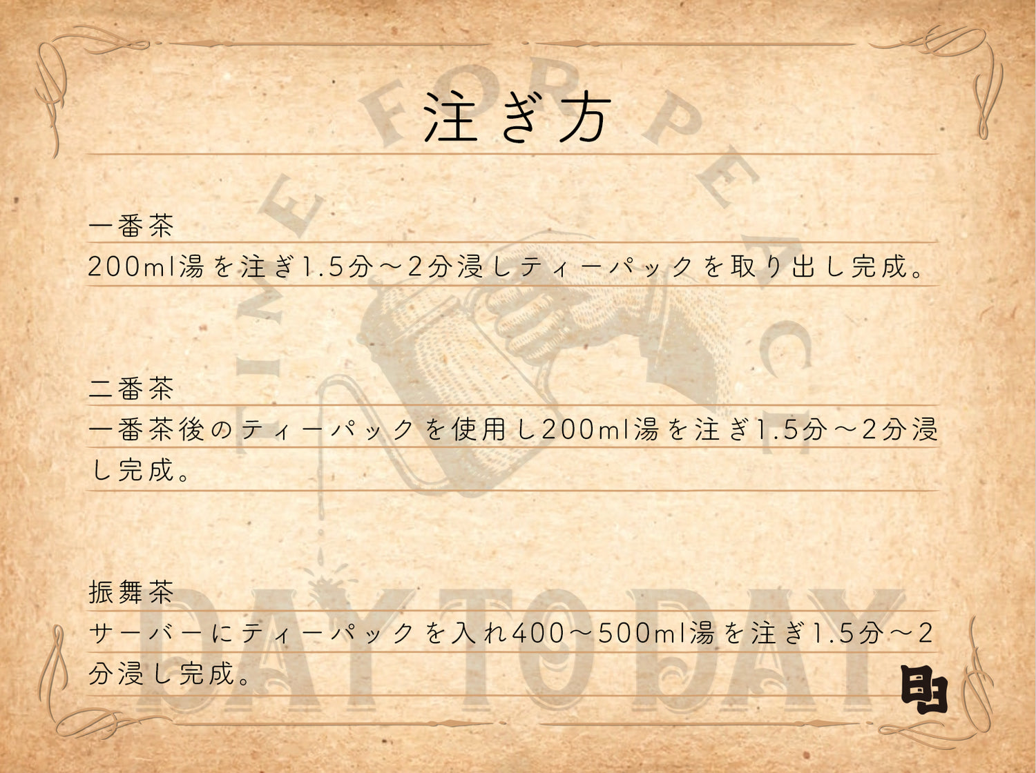 二番茶・・・一番茶後のティーパックを使用し、200ml注ぎ1.5分〜2分浸し、ティーパックを取り出さずそのままお召し上がりください。